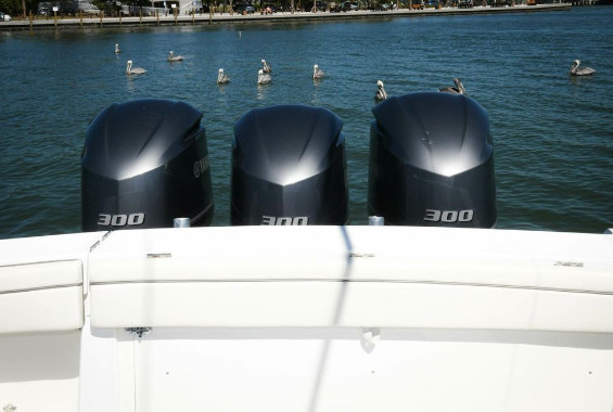 The 2014 Jupiter 38 Center Console named KT is a meticulously maintained boat with only 345 hours on its Triple Yamaha 300 engines. Equipped for both leisure and fishing, KT boasts features such as a Marlin Tower, Out Riggers, Bow Thruster, and Updated Furuno Electronics with Side Scan Sonar. The air-conditioned Cuddy Cabin in the forward section includes refrigeration and a microwave, providing comfort during extended trips. The recent completion of Yamaha Engine Service and Bottom Job on 9/23 ensures that KT is in prime condition for its next owner.