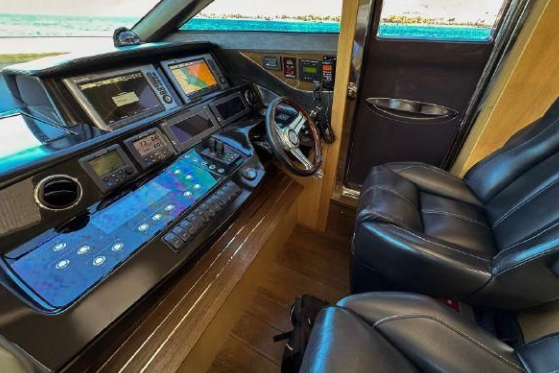 The 2013 Princess V72 is a 72-foot luxury motor yacht with a fiberglass hull and petrol power. It features a 27.5kW ONAN Diesel generator, advanced electronics like radar and FURUNO GPS, and comfortable interior amenities including air conditioning and a fresh water maker. Outside, the yacht offers a teak cockpit and a Williams 385 Turbojet tender. With a cruising speed of 30 knots and a max speed of 36 knots, it combines performance and luxury, measuring 72.83 feet in length with a 17.65-foot beam and a fresh water tank capacity of 1,162.36 gallons.